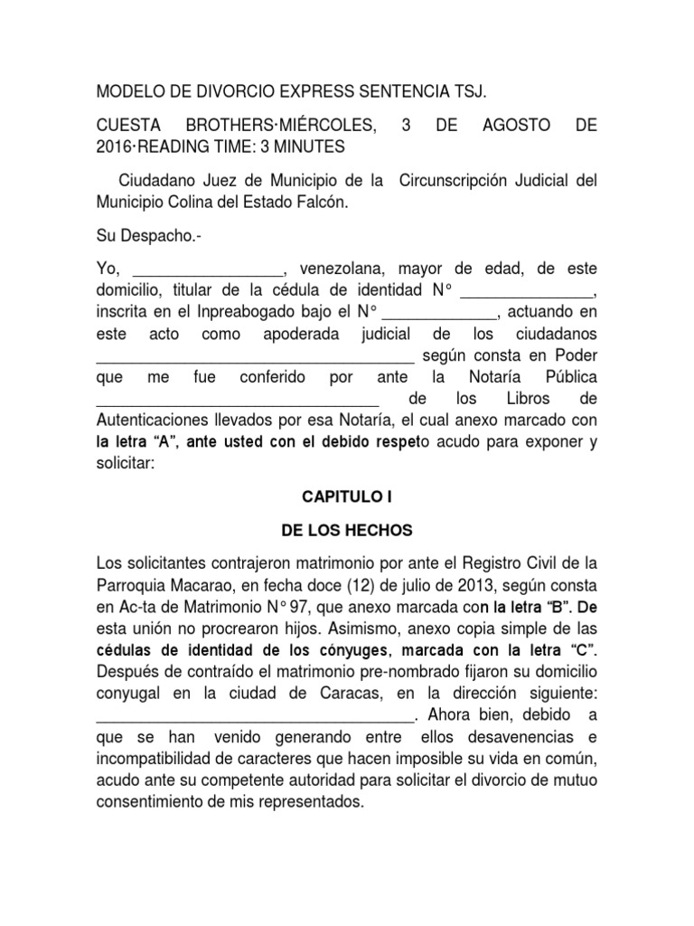 Utilice nuestra plantilla para crear descargar e imprimir su acuerdo de divorcio. Modelo Convenio Regulador de Divorcio MODELO -1 CONVENIO REGULADOR DE DIVORCIO QUE DE MUTUO ACUERDO SUSCRIBEN LOS CNYUGES DON ________ Y DOA ______ EN BASE A LO ESTABLECIDO EN LOS ARTCULOS 82 Y 90 DEL VIGENTE CDIGO CIVIL. CONVENIO REGULADOR DE DIVORCIO MODELO 1 Versin para imprimir.