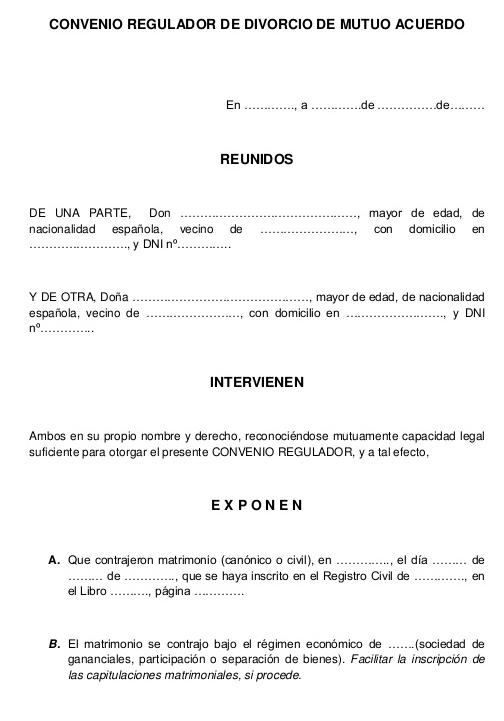 Nuestro equipo de abogados expertos en divorcios les muestra un modelo de convenio regulador de divorcio con hijos y propiedades debindose adaptar a cada caso concreto. Don mayor de edad vecino de con domicilio en y titular del DNI nmero de una parte y Doa mayor de edad vecina de con domicilio en y titular del DNI nmero de otra. Puede descargar en word un fichero en blanco.