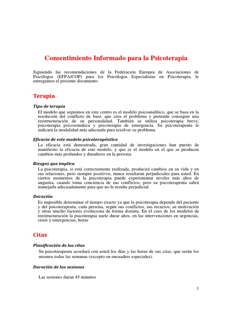 El tratamiento que realizamos se denomina psicoterapia y consiste en una conversacin entre un a terapeuta y la s persona s consultantes. Revista de Derecho vLex. CONSENTIMIENTO INFORMADO TERAPIA PSICOLGICA ONLINE.