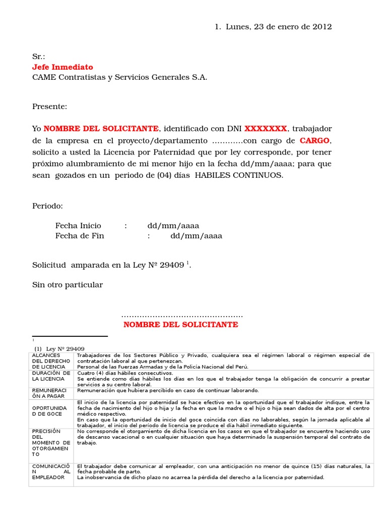 1 Ley N 29409 ALCANCES DEL DERECHO DE LICENCIA DURACIN DE LA LICENCIA REMUNERACI N A PAGAR OPORTUNIDA D DE GOCE PRECISIN DEL MOMENTO DE OTORGAMIEN TO COMUNICACI. Formulario que se debe rellenar para realizar la solicitud de la prestacin de paternidad as como modelos de certificados de empresa segn diferentes casusticas. Descarga aqu nuestra Solicitud licencia de paternidad.