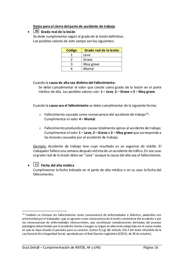 El Parte debe ser cumplimentado por las empresas con trabajadores por cuenta ajena y por los trabajadores por cuenta propia o autnomos que tengan cubierta esta contingencia y sern remitidos a la Entidad Gestora o Colaboradora que tenga a su cargo la proteccin por accidente de trabajo en el plazo mximo de cinco das hbiles desde la fecha en que ocurri el accidente o desde la. Los accidentes de trabajo de empleados que no han requerido sin baja deben comunicarse a travs del sistema DELTA y para eso deben seguirse estas pautas. La baja mdica del trabajador como consecuencia directa de un accidente anterior.