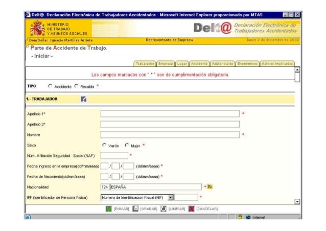Parte de accidente de trabajo modelo delta. IPF Identificador de Persona Fsica. El parte de accidente de trabajo vigente se configura a travs de lo indicado en la Orden Ministerial TAS29262002 de 19 de noviembre por la que se establecen nuevos modelos para la notificacin de los accidentes de trabajo y se posibilita su transmisin por. SI NO Marque si se ha realizado evaluacin de riesgos sobre el puesto de trabajo en el que ha ocurrido el accidente Descripcin.