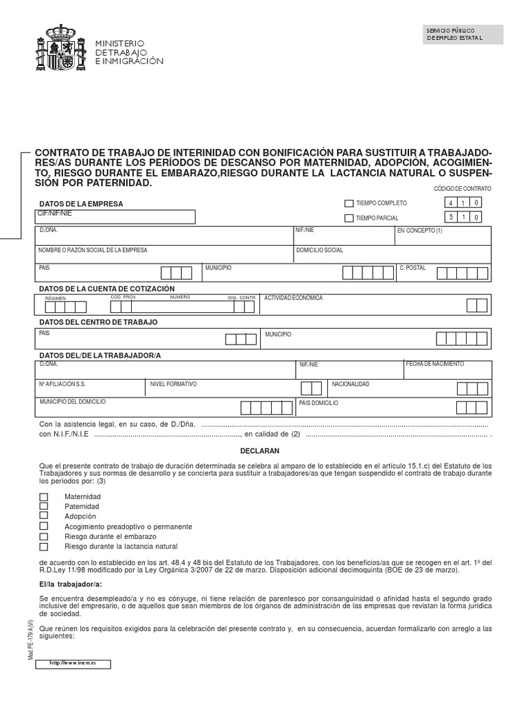 El contrato de interinidad es un documento que sirve para poder dejar en escrito el deseo de remplazar a un empleado pero que este individuo tenga la posibilidad de poder acceder a su derecho a que su puesto de trabajo le sea reservado de tal manera qu. El Ministerio de Trabajo espaol a travs del Servicio Pblico de Empleo Estatal pone a disposicin de empresas y trabajadores un modelo de contrato de trabajo de interinidad con bonificacin para sustituir a trabajadores durante los perodos de descanso por maternidad adopcin acogimiento riesgo durante el embarazo riesgo durante la lactancia natural o suspensin por. El contrato de interinidad es el contrato que se debe formalizar para sustituir a un trabajador con derecho a reserva del puesto de trabajo supuesto que resulta ms comn y para ocupar un puesto de trabajo pendiente de cobertura definitiva tras mediar un proceso de seleccin.