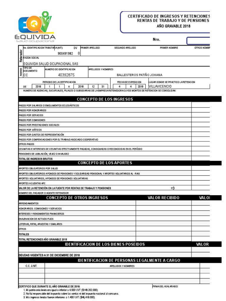 Si se opta por el acceso con referencia independientemente del ejercicio fiscal para el que se solicita la certificacin. Equivida salud ocupacional sas. Certificado de retenciones e ingresos a cuenta del Impuesto sobre la Renta de las Personas Fsicas Rendimientos del trabajo dietas exceptuadas de gravamen y rentas exentas Datos correspondientes al ejercicio NIF Apellidos y nombre denominacin o razn social Datos de la persona o entidad pagadora Rentas exentas del IRPF incluidas por la empresa o entidad pagadora en el resumen anual de.
