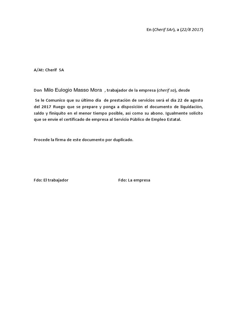 Como se exige un preaviso mnimo de 15 das pues dijo que el ltimo da de trabajo sera el viernes 18 de diciembre por tanto preavisado con das de sobra. Servicio P blico de Empleo Estatal. Modelos de Carta Finiquito Preaviso y otros requisitos.
